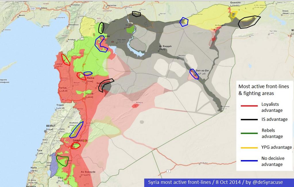 درحال حاضر حدود 13 جبهه ی اصلی در سوریه فعال هست که رنگ هر یک از جبهه ها نشون میده که کدوم گروه دست برتر و بالا رو در اختیار داره .