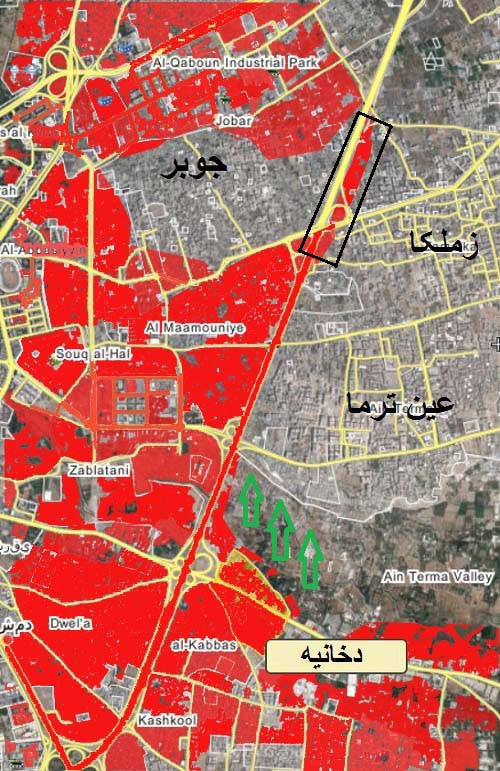 ارتش سوریه موفق شد خط تماس بین زملکا و جوبر رو بطور کامل قطع کنه ، در واقع با این کار یکی از راههای امداد مسلحین بسته شد ...
