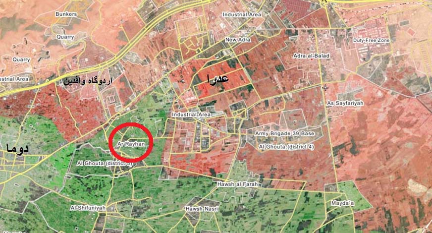 از دوما خبر میرسه که ارتش موفق شد منطقه کارگری واقع درمزارع الریحان در حد فاصل بین دوما و عدرا رو به تصرف خودش در بیاره .
